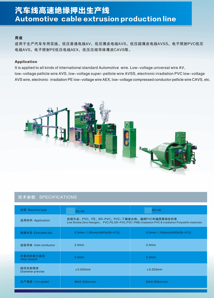 主營產(chǎn)品:懸臂單絞機(jī),成纜機(jī),高速絞線機(jī),銅線束絲機(jī),雙絞機(jī),對(duì)絞機(jī),三倍絞線機(jī),退扭機(jī),芯線集合機(jī),管絞機(jī),框絞機(jī),電線押出機(jī),高速押出機(jī),物理發(fā)泡同軸電纜、數(shù)據(jù)電纜三層工擠生產(chǎn)線,光纖押出機(jī),硅膠線生產(chǎn)線,鐵氟龍押出出生產(chǎn)線,電力電纜生產(chǎn)線,電子線押出機(jī),電源線押出機(jī),